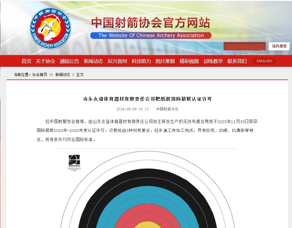 目前,主要生產(chǎn)和銷售射箭比賽及訓練專用器材,包括:箭靶、靶紙、靶架、號碼牌、風向旗、計時記分器等場地器材設(shè)備;反曲弓、復合弓、傳統(tǒng)弓、瞄準器、防震桿等弓箭裝備;箭壺、護胸、護臂、護指等各類箱包護具。公司所生產(chǎn)的射箭器材已通過國際射箭聯(lián)合會及中國射箭協(xié)會CAA認證。